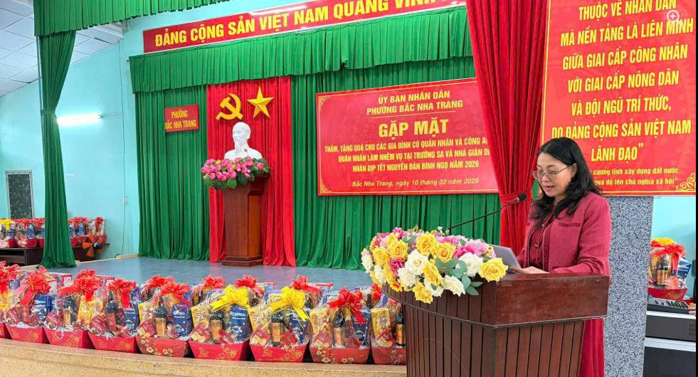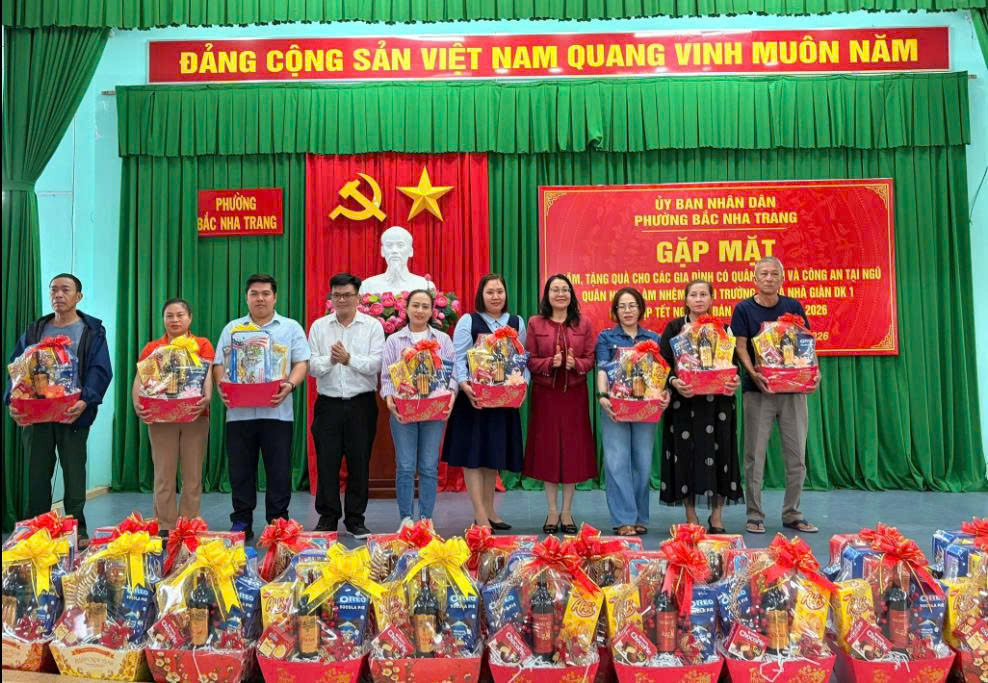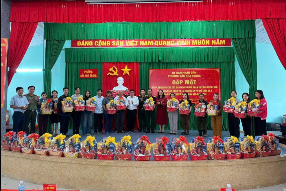 Ngày 10/02/2026, tại Hội trường Trung tâm văn hóa phường Bắc Nha Trang (Số 03 Quảng Đức). Nhân dịp Tết Nguyên đán Bính Ngọ năm 2026, nhằm thể hiện sự quan tâm, chăm lo của cấp ủy, chính quyền và các tổ chức đoàn thể đối với gia đình quân nhân, chiến sĩ đang làm nhiệm vụ nơi biên cương, hải đảo của Tổ quốc đang làm nhiệm vụ tại trường sa, nhà giàn dk1, quân nhân và chiến sĩ công an đang tại ngũ.