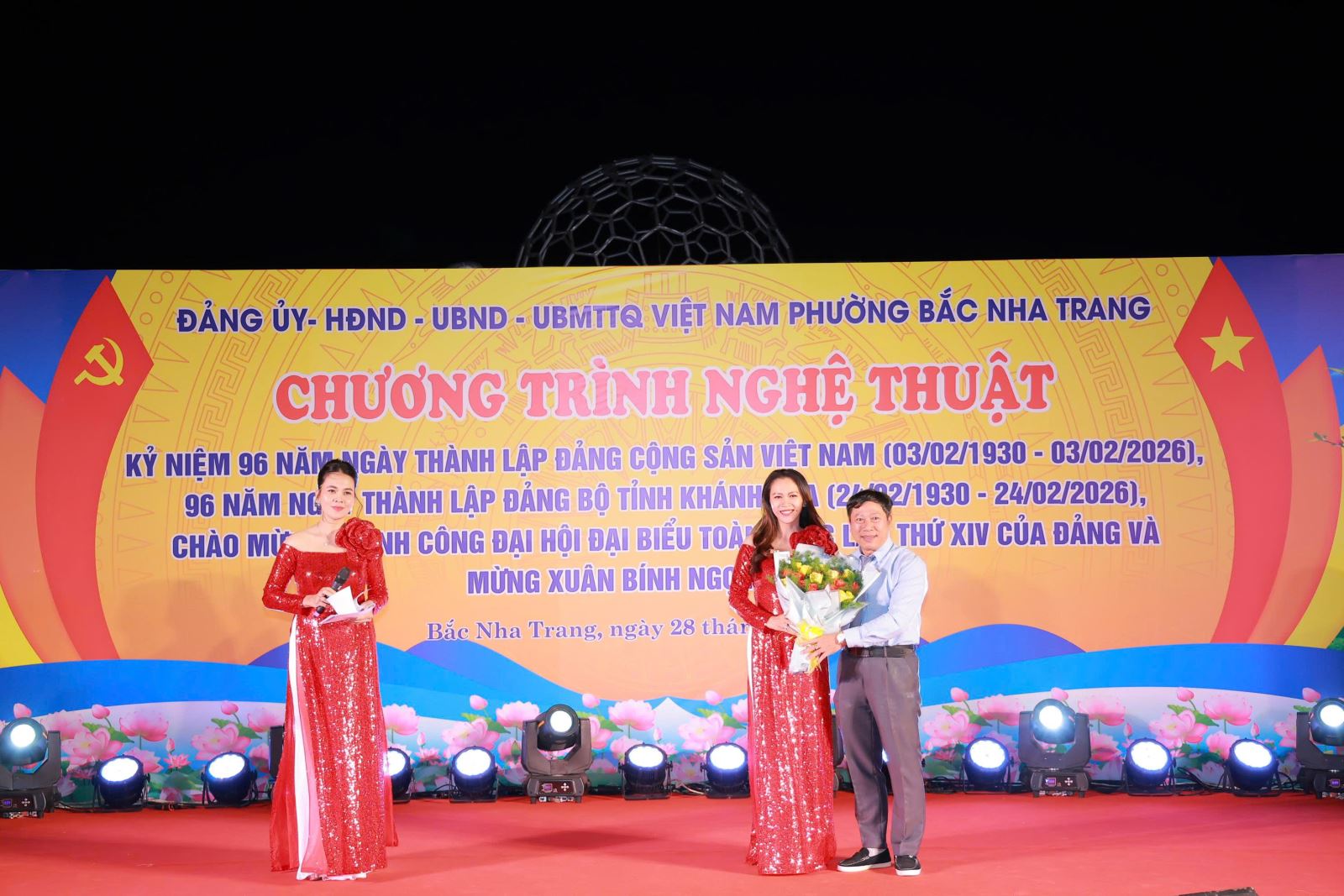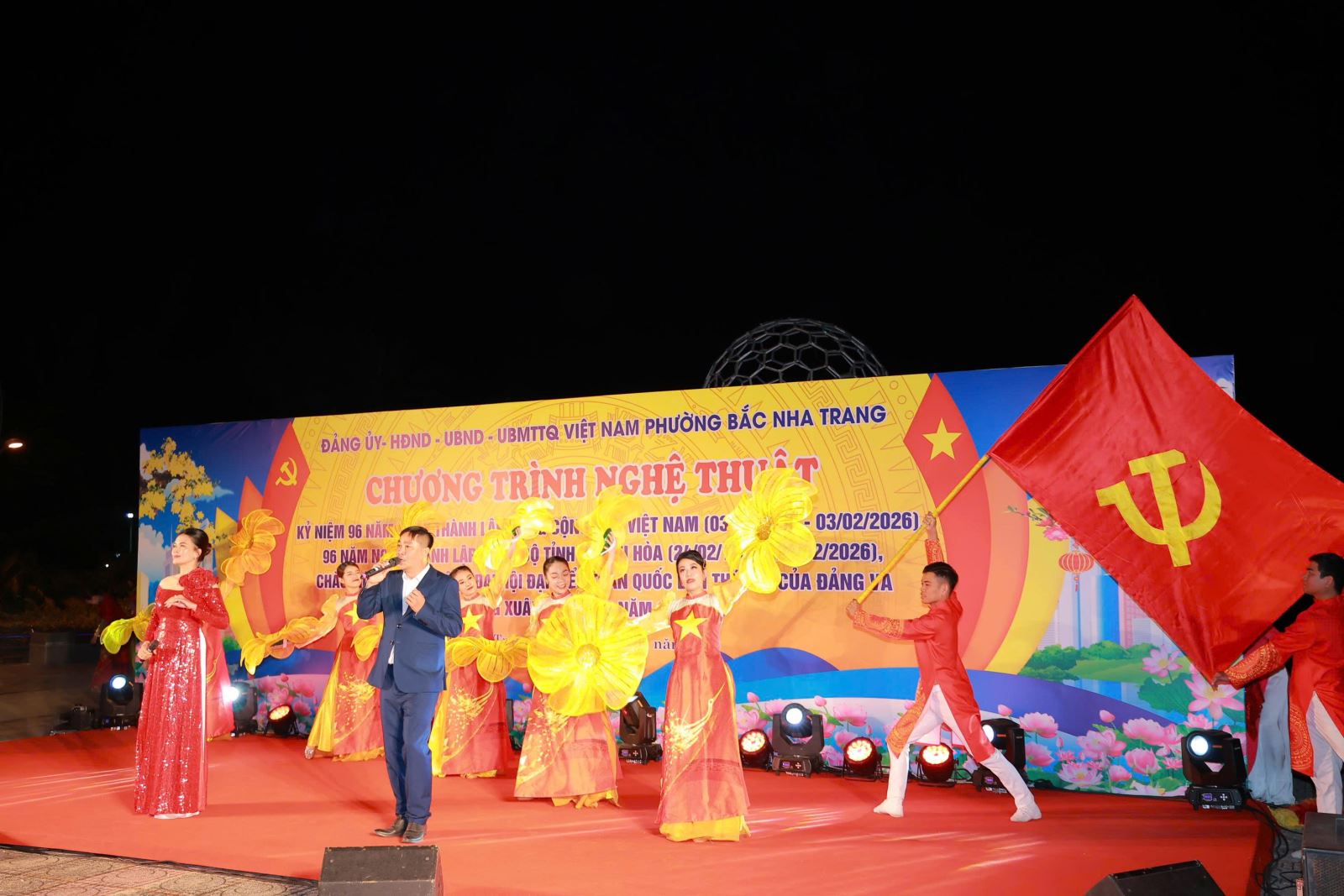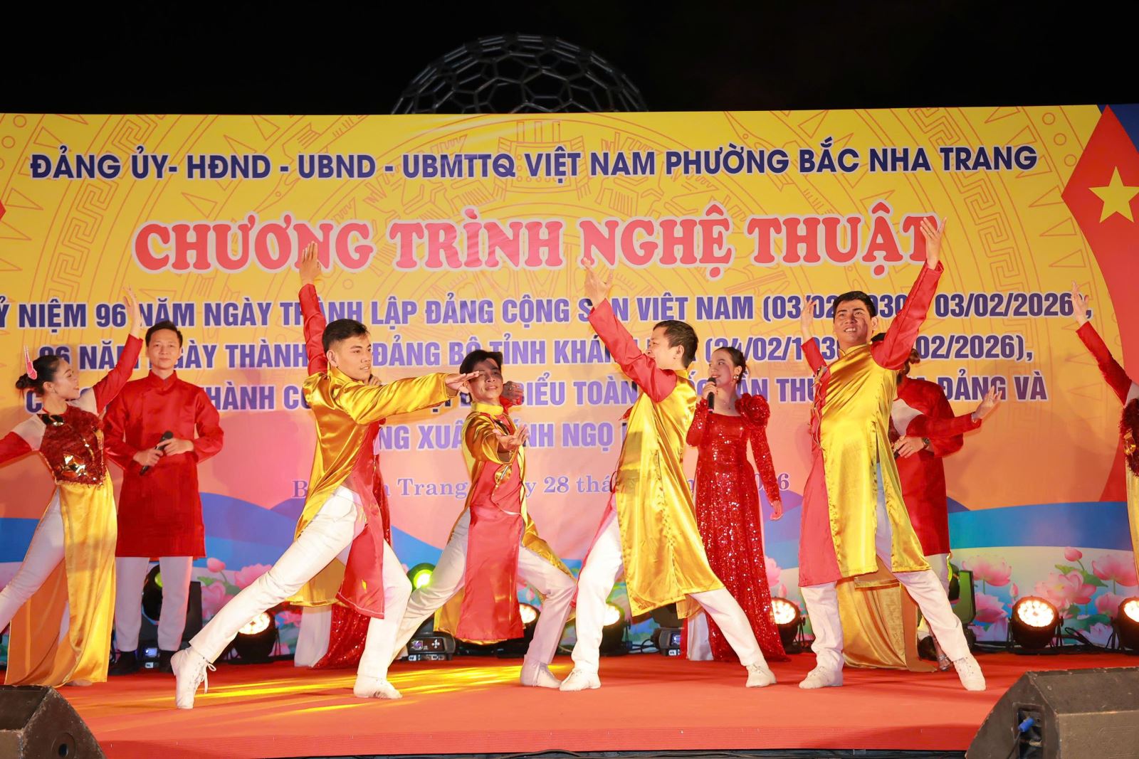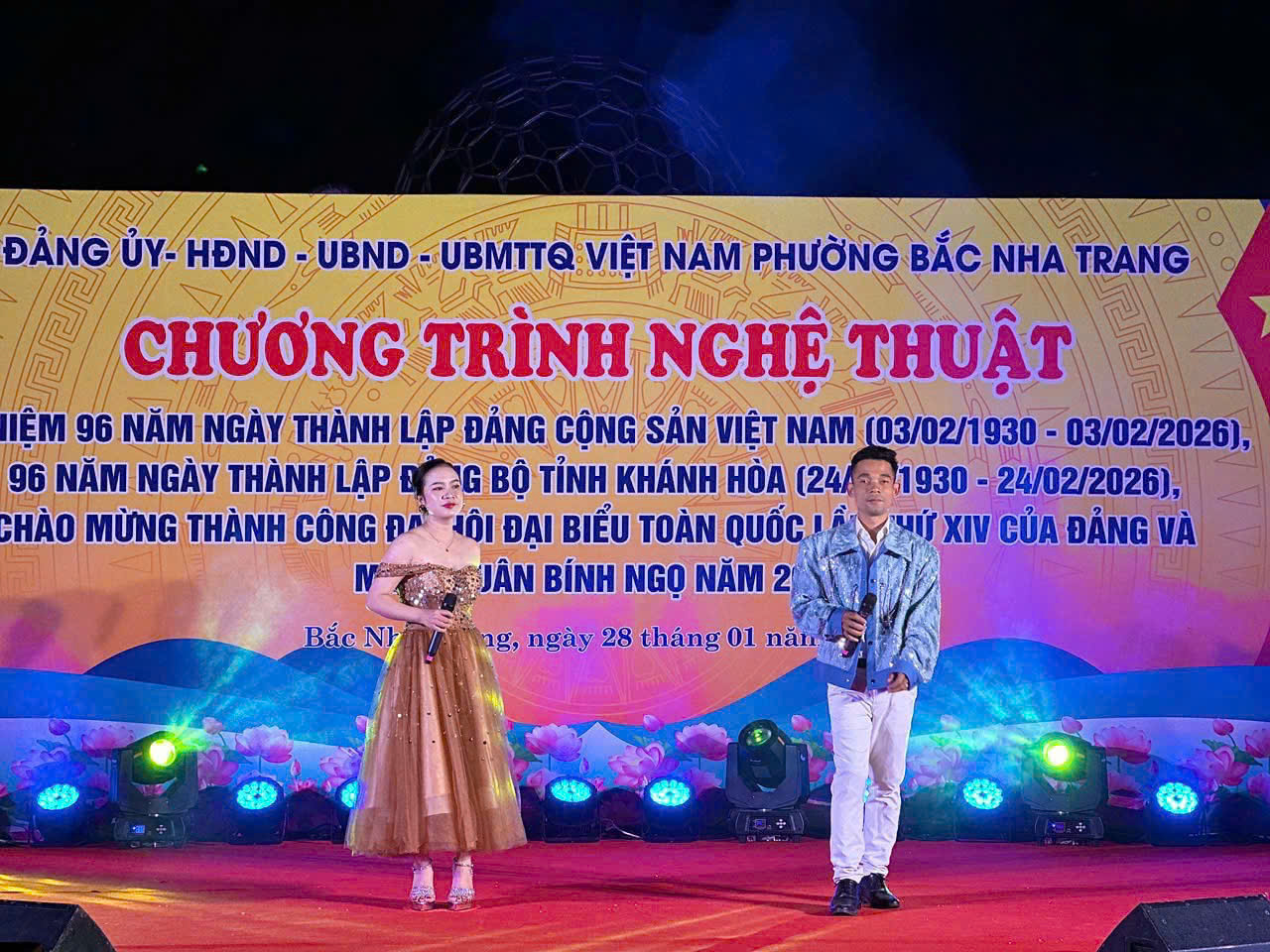 Thực hiện kế hoạch số 2858/KH-UBND ngày 12/11/2025 của UBND phường Bắc Nha Trang về việc Tổ chức các hoạt động chào đón năm mới 2026 và Tết Nguyên đán “Mừng Đảng - Mừng Xuân Bính Ngọ”; được sự cho phép của Đảng uỷ, HĐND. Tối ngày 28/01/2026 tại Công viên yến sào phường Bắc Nha Trang. UBND phường tổ chức Chương trình nghệ thuật kỷ niệm 96 năm Ngày thành lập Đảng Cộng sản Việt Nam (03/02/1930- 03/02/2026), 96 năm Ngày thành lập Đảng bộ tỉnh Khánh Hòa (24/02/1930 24/02/2026), chào mừng thành công Đại hội đại biểu toàn quốc lần thứ XIV của Đảng và mừng Xuân Bính Ngọ - 2026.