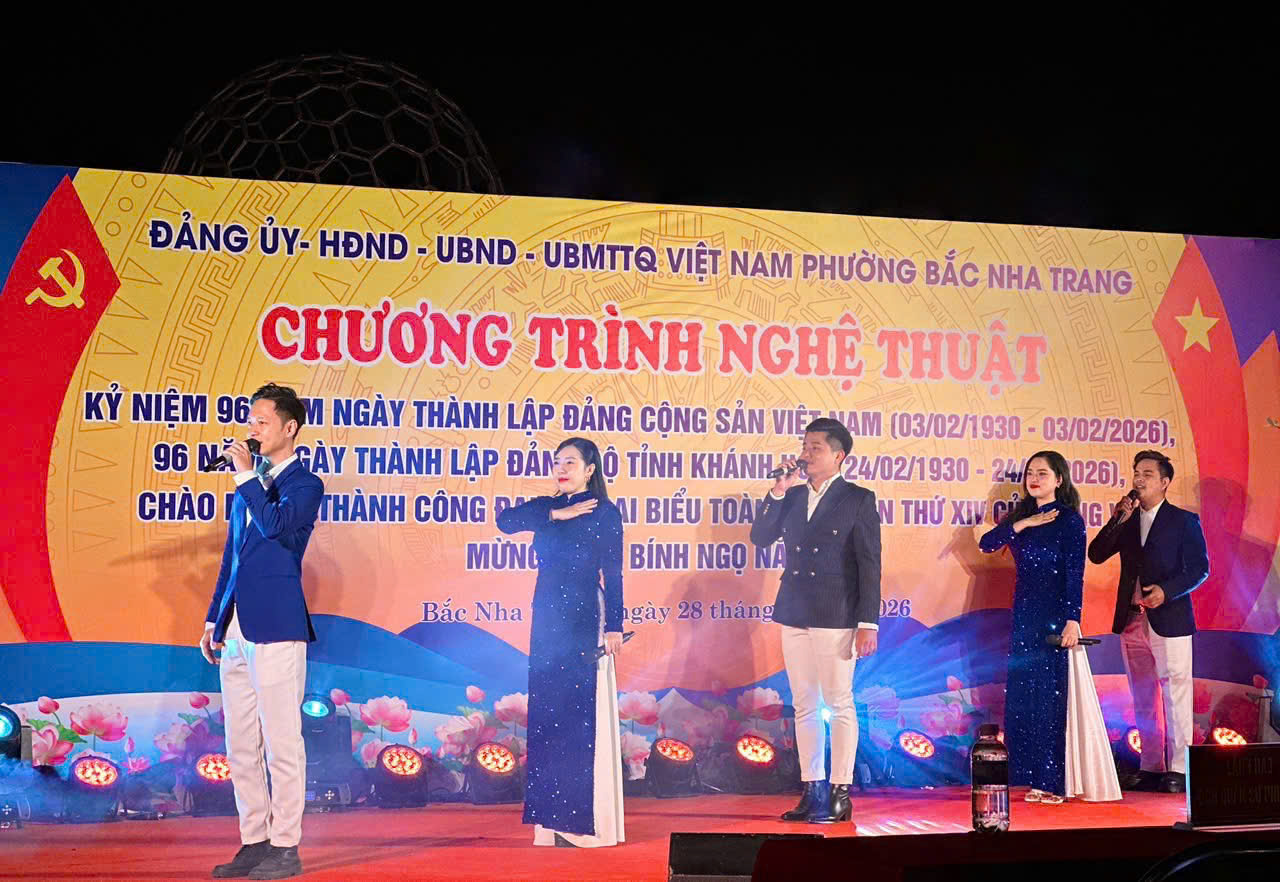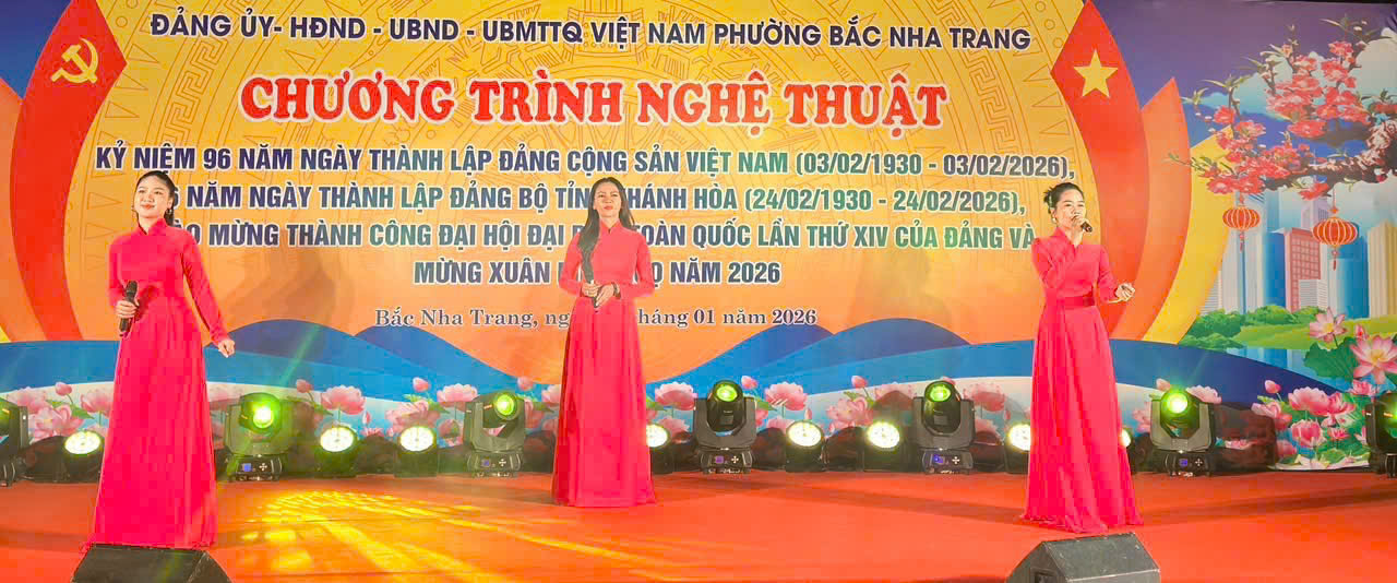 Chương trình nghệ thuật kỷ niệm 96 năm Ngày thành lập Đảng Cộng sản Việt Nam (03/02/1930- 03/02/2026), 96 năm Ngày thành lập Đảng bộ tỉnh Khánh Hòa (24/02/1930 24/02/2026), chào mừng thành công Đại hội đại biểu toàn quốc lần thứ XIV của Đảng và mừng Xuân Bính Ngọ - 2026 đã thành công tốt đẹp, mang đến một bầu không khí vui tươi phấn khởi nhưng trang nghiêm thể hiện lòng biết ơn Đảng, Bác Hồ của cán bộ và Nhân dân phường Bắc Nha Trang, tỉnh Khánh Hòa đang rạo rực chuấn bị đón Xuân Bính Ngọ 2026./.
